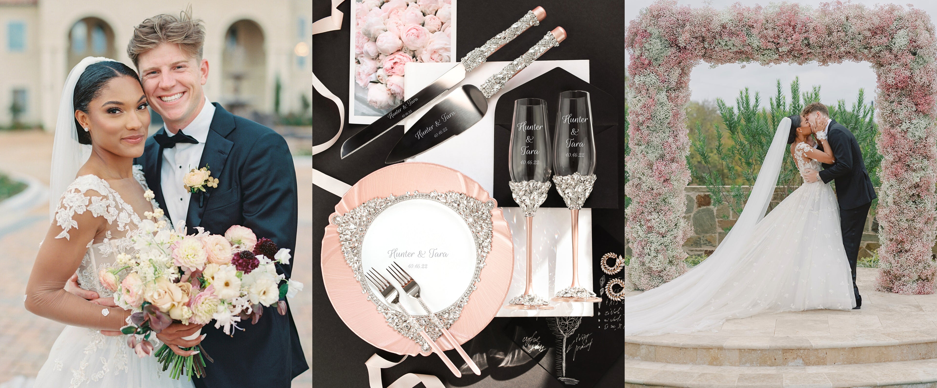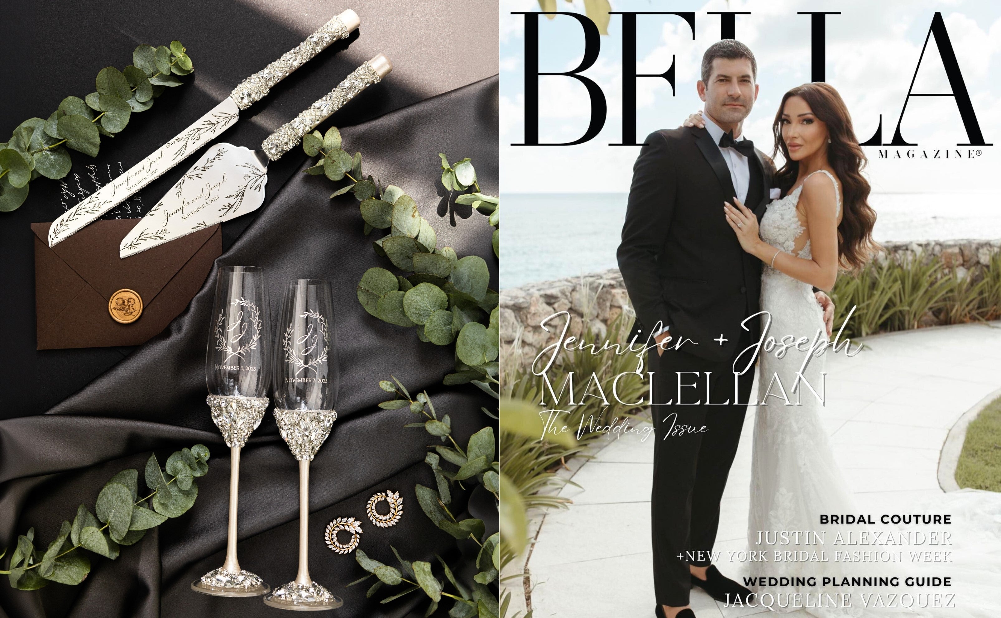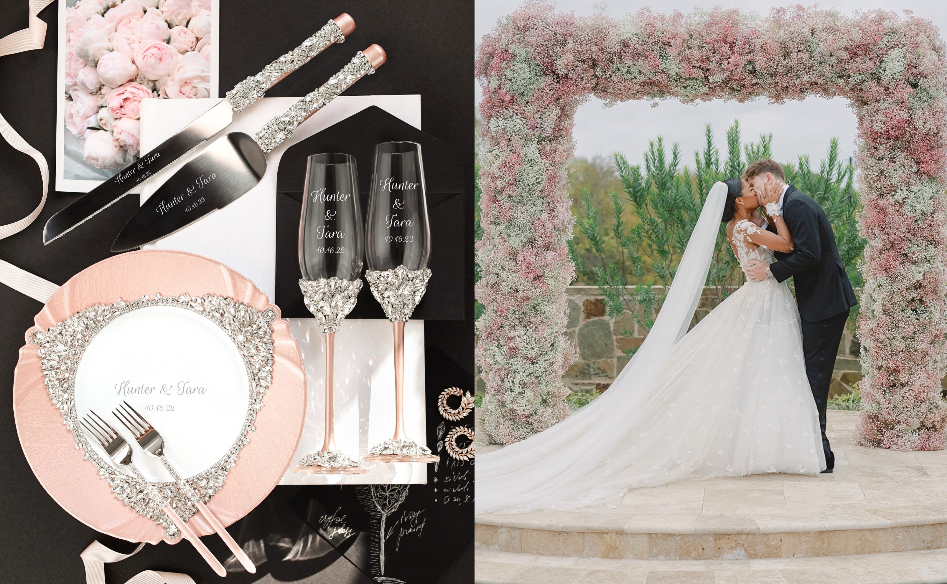 Personalized flutes and cake sets are created to remind of wedding day for years to come!