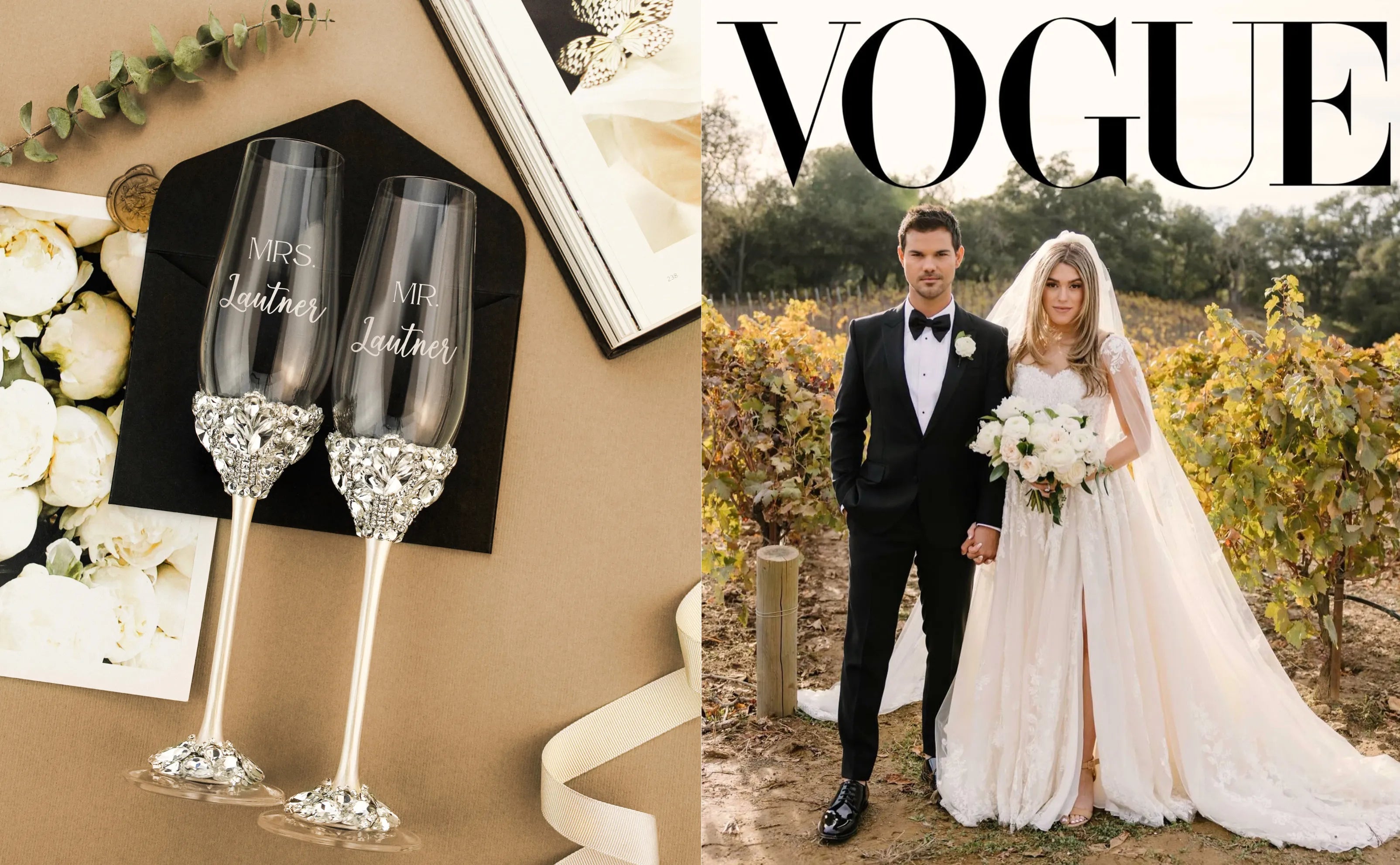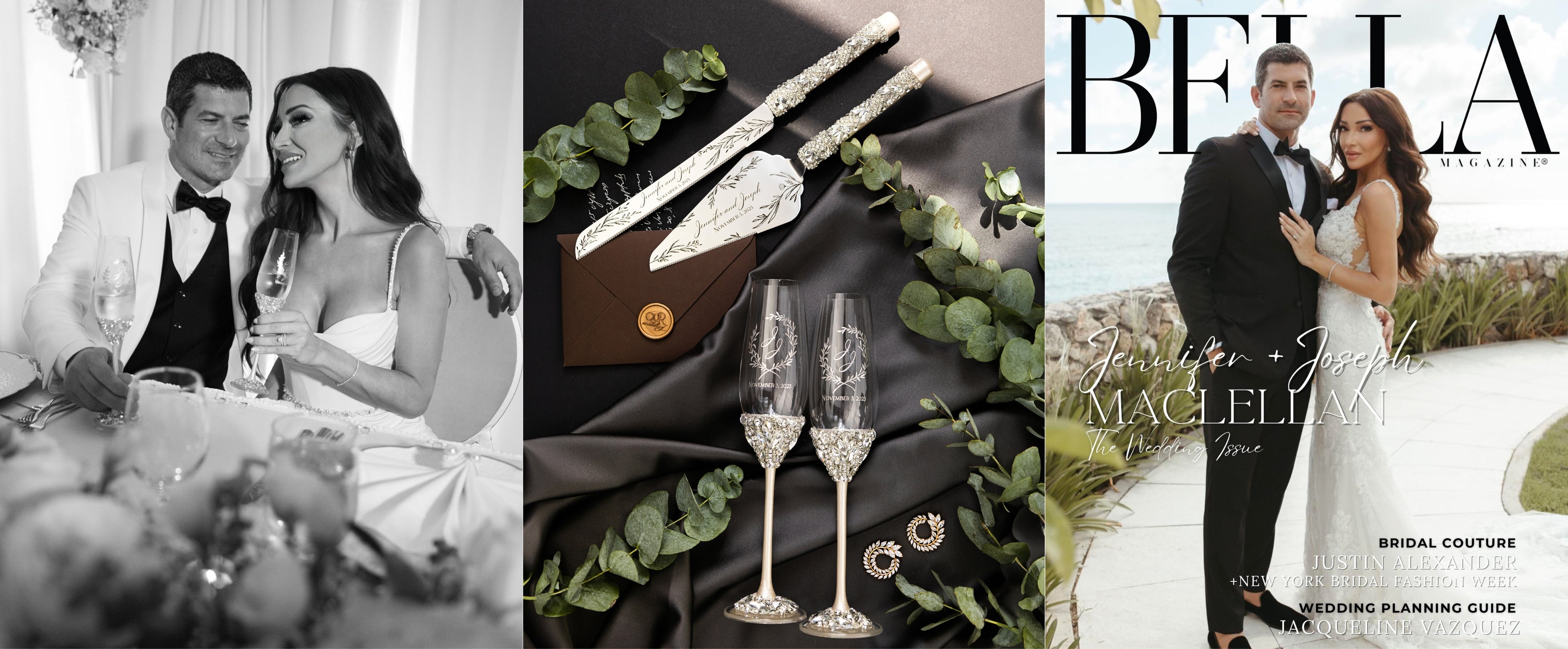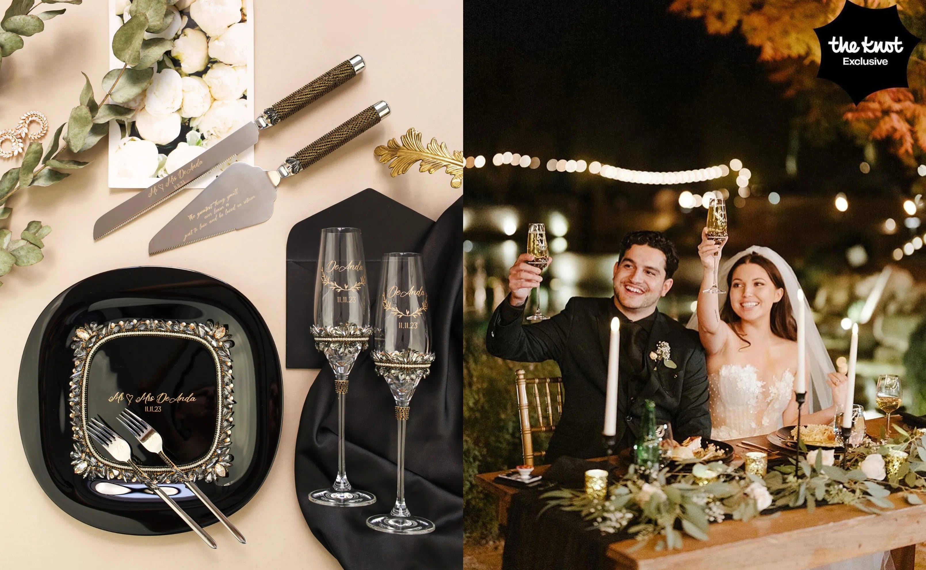 Personalized flutes and cake sets are created to remind of wedding day for years to come!