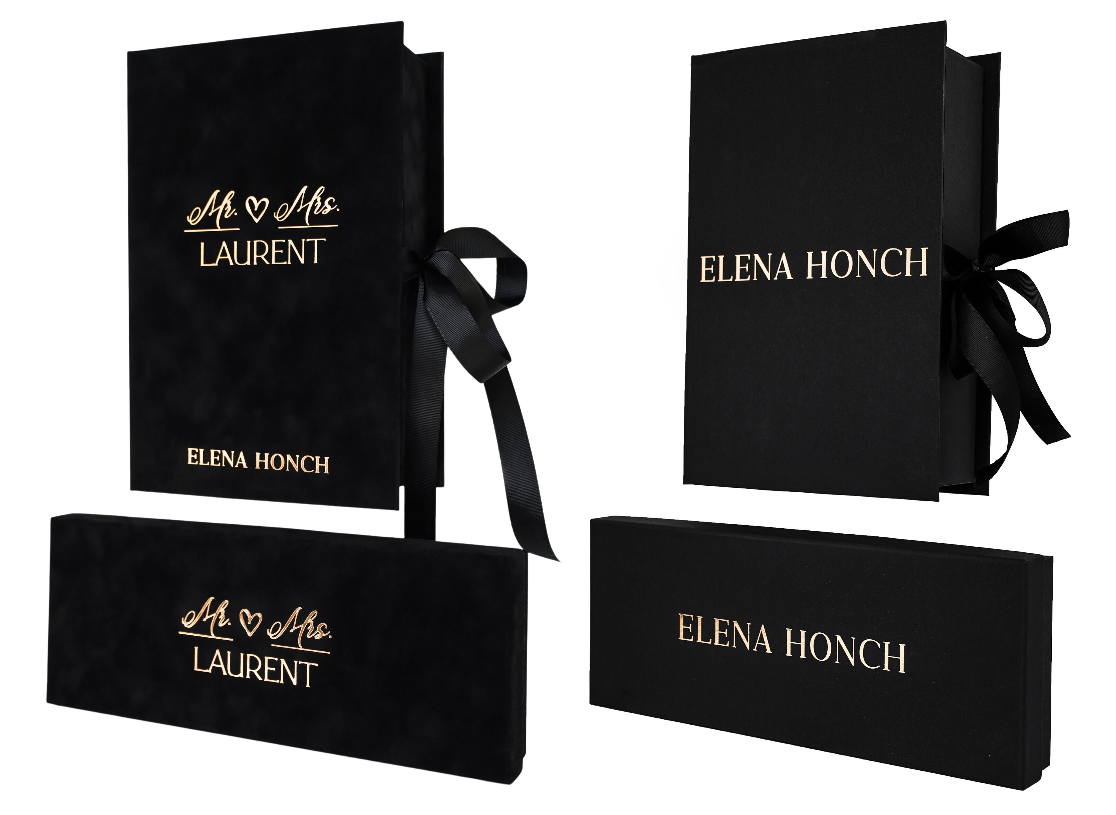 Velvet Personalized Boxes: Personalized velvet gift boxes will not only make a WOW effect, but can also serve as beautiful storage for your set in the future. You can add your unique text on the cover: names, surnames, initials, wedding date, everything you want!