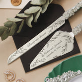 The Elegance of Emerald! Floral cake set boasts delicate engravings that whisper “Forever and Always” — a sweet promise that echoes in every bite. A porcelain plate with steel forks is handcrafted for the most delicious first piece of the wedding cake!