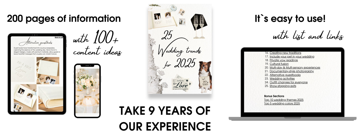 - Personalized Guidance: Practical tips for integrating trends into your wedding and making sustainable, meaningful choices. Wedding activity ideas, alternative guestbooks, and unforgettable reception decor...
