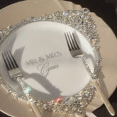 We use crystal glasses, cake sets with a sturdy handle and mirrored metal, non-toxic acrylic paint and crystal rhinestones. We lay out the designs with the latest generation glue that has better properties.