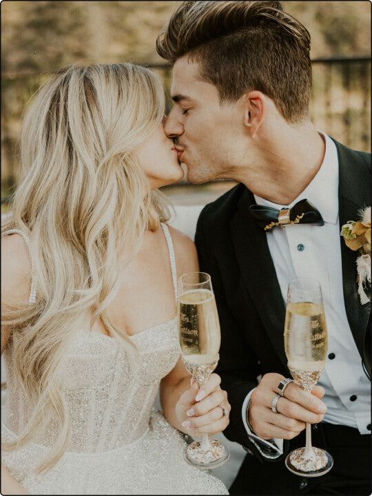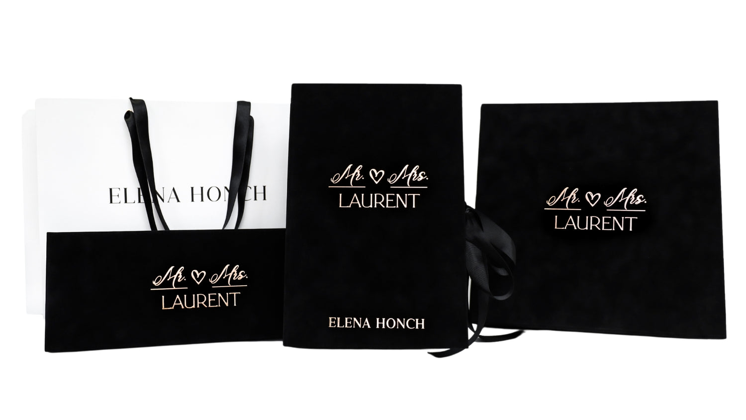 Personalized velvet gift boxes will not only make a WOW effect, but can also serve as beautiful storage for your set in the future. You can add your unique text on the cover: names, surnames, initials, wedding date, everything you want!