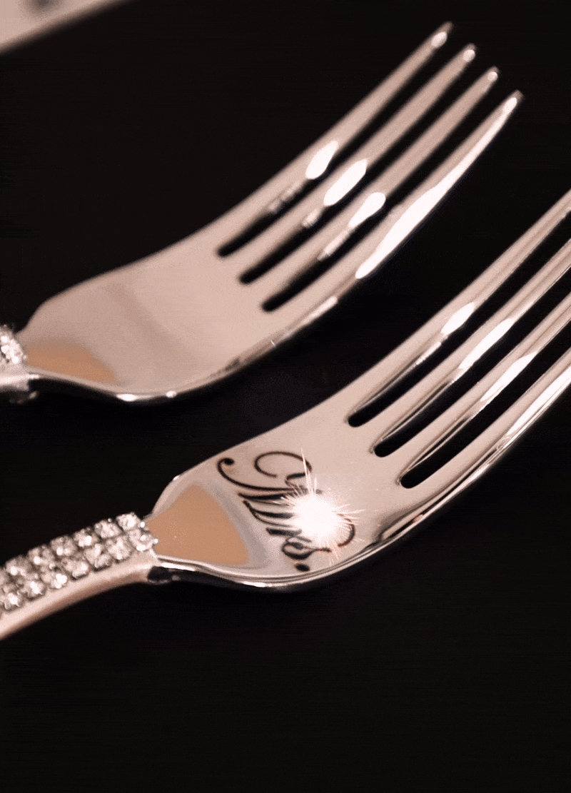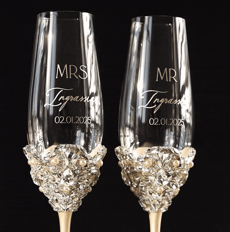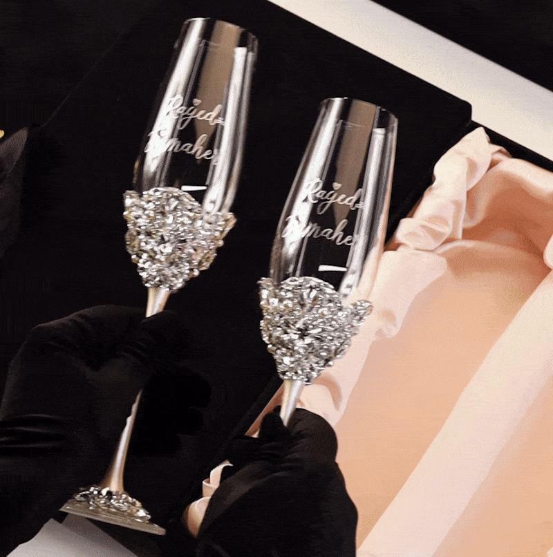 We use crystal glasses, cake sets with a sturdy handle and mirrored metal, non-toxic acrylic paint and crystal rhinestones. We lay out the designs with the latest generation glue that has better properties.