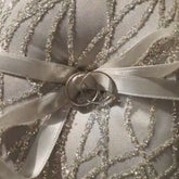 The pillow is completely handmade in silver color and decorated with ribbon and sequins to add sparkle to your celebration. The size 20x20.