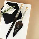 Personalized Ruta Set in Champagne reflects the essence of your everlasting love and special moments! Crystal flutes and cake set united by laser engraving, adorned with premium rhinestones, and designed for those who appreciate the beauty of uniqueness.