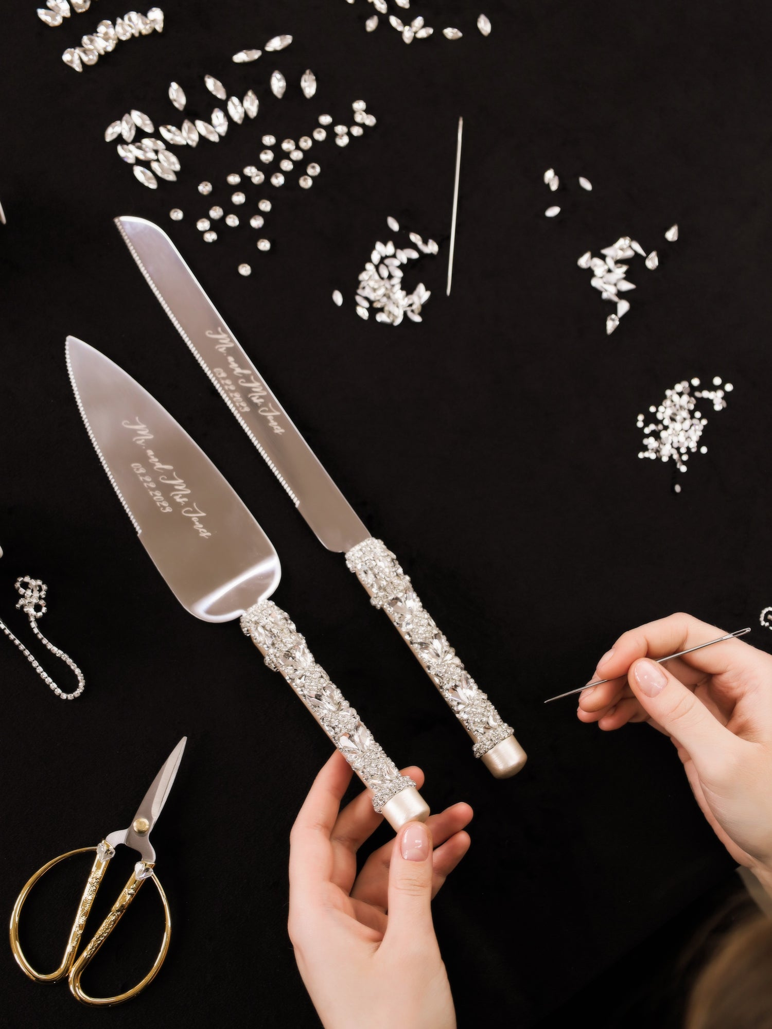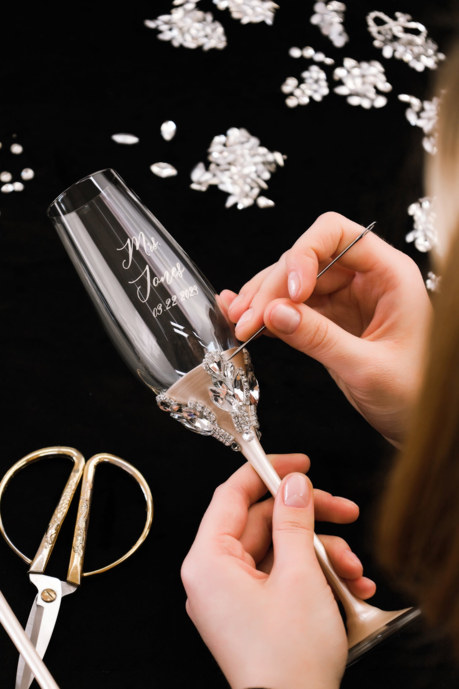 We use crystal glasses, cake sets with a sturdy handle and mirrored metal, non-toxic acrylic paint and crystal rhinestones. We lay out the designs with the latest generation glue that has better properties.