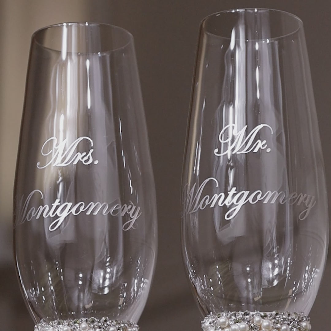 Personalized set Lily Ivory with pearls reflects the essence of your everlasting love and special moments! Crystal flutes and cake set united by laser engraving, adorned with premium rhinestones, and designed for those who appreciate the beauty of uniqueness.
